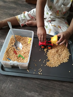 So a few days back I ordered a 5 kilo bag of toor dal by mistake instead of a 2 kilo bag! Just seeing so much of toor dal at home, made me realise it was time to set a sensory activity for the Mini! :D I did not dare to venture out using flour or rice or anything else that I felt will be a problem to clean after. Toor dal seemed doable to start with.